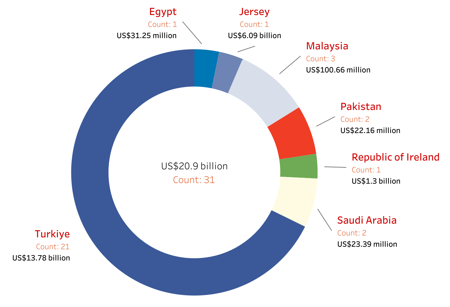 The Republic of Ireland ranks third, with US$1.3 billion in AuM, also from a solitary fund. Other notable jurisdictions include Malaysia (US$100.66 million across three funds), Pakistan (US$22.16 million, two funds), Saudi Arabia (US$23.39 million, two funds) and Egypt ($US31.25 million, one fund).