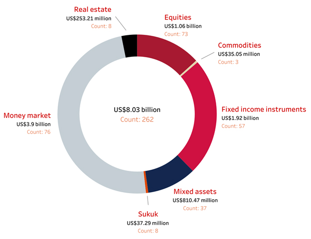 Investors in the Islamic market continue to show a sophisticated, if cautious, preference for highly liquid instruments. Money market funds dominate the landscape, holding US$3.9 billion in AuM across 76 different funds.