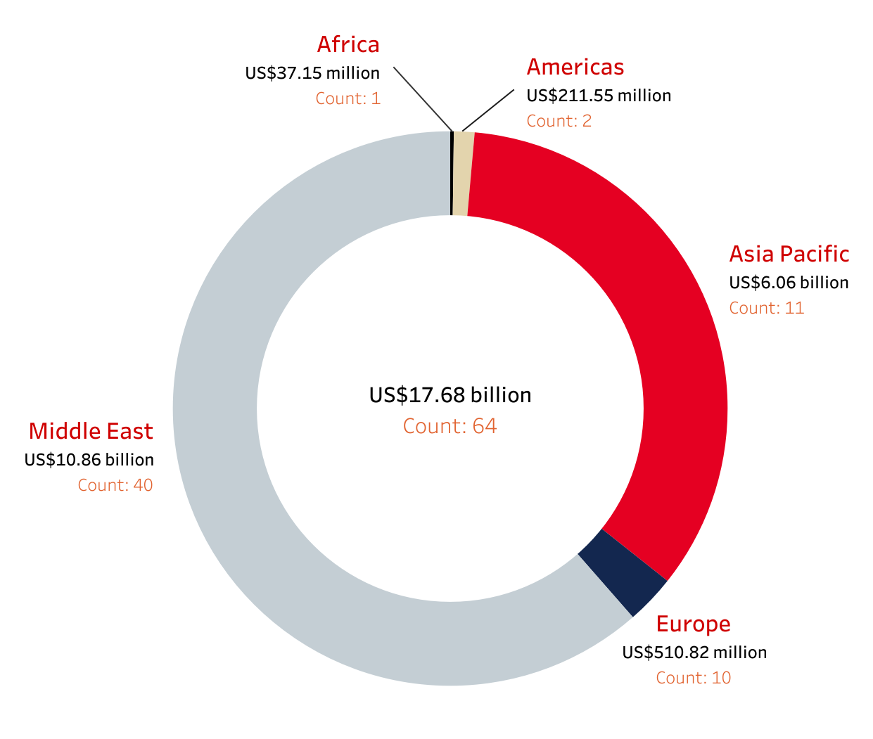 This is particularly evident in Saudi Arabia, which is undertaking massive development projects, with a transaction value of US$34 billion in the first half of 2024, a 38% surge. Projects like Jeddah Economic City and the Thakher Makkah development are examples of this growth.