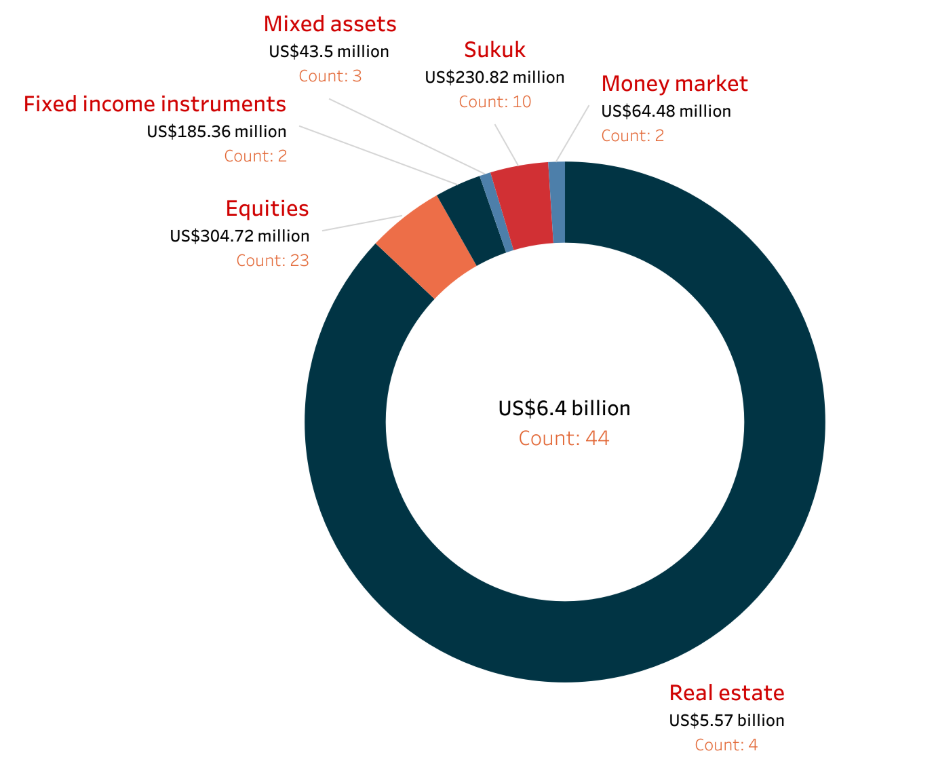 Trailing the more established Sukuk market, fixed income instruments hold a modest US$185.36 million across just two funds. This category is distinct from Sukuk, representing a niche segment likely focused on specialized Shariah compliant debt structures that go beyond traditional Islamic bonds. These might include funds investing in Murabahah, Ijarah or Istisna where the underlying assets or services provide a fixed, Shariah compliant return.
